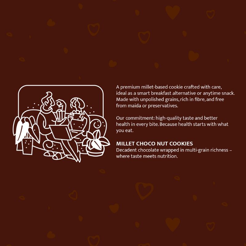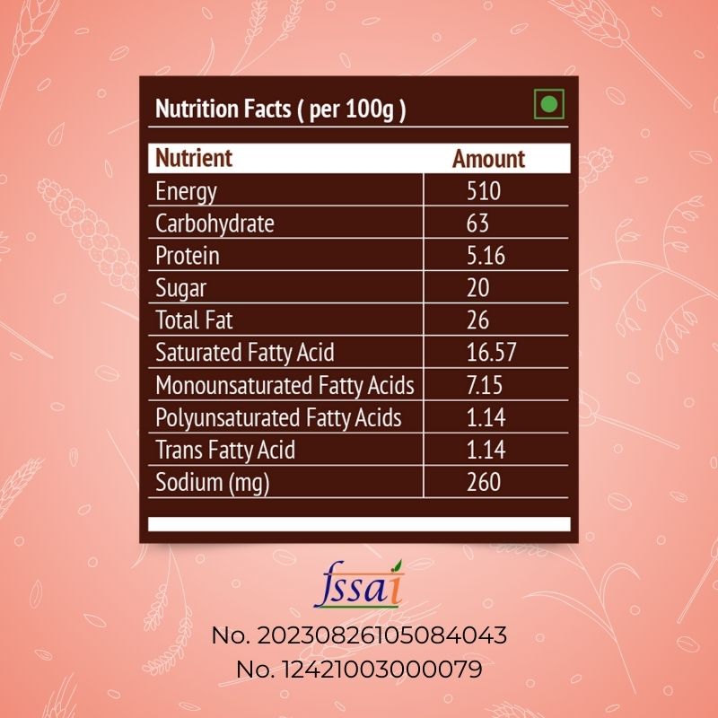 Whole Wheat Flour 12% , Multigrain Flour 10% (Thinai, Samai, Varagu, Jowar), Cocoa Powder 3%, Cashew Bits 3.5%