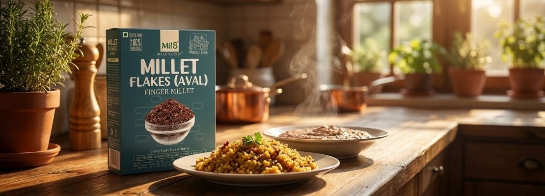 Finger Millet Flakes Cook or Ready-to-Eat Healthy Millet Meal Healthy eating doesn’t have to be time-consuming. Finger Millet Flakes (Aval) are a smart choice for anyone looking for a quick, nutritious, and versatile millet m....