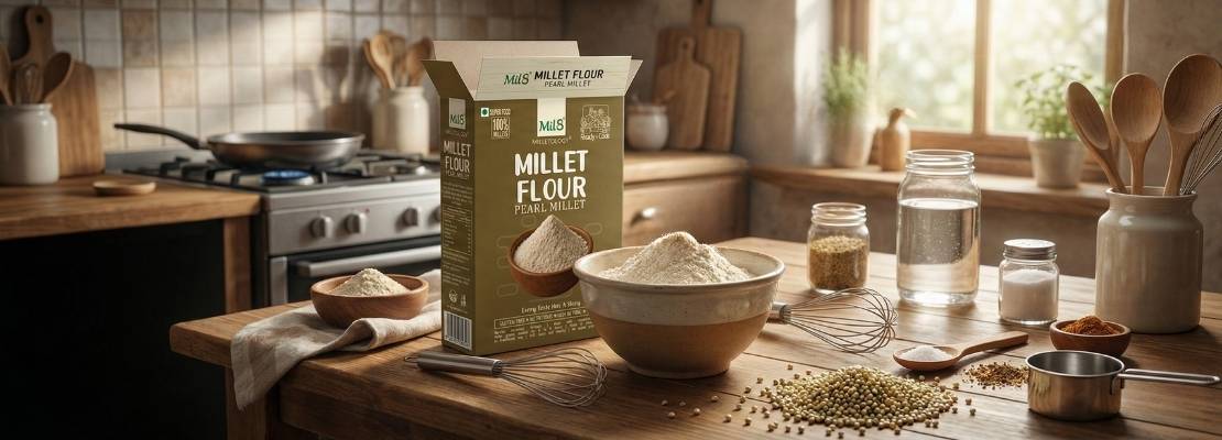 Pearl Millet Flour — Nutritious, Balanced & Ready to Cook Delicious Meals Pearl Millet Flour — also known as Kambu flour — is a wholesome, gluten-free flour that brings nutritional power and earthy flavor to your ev....